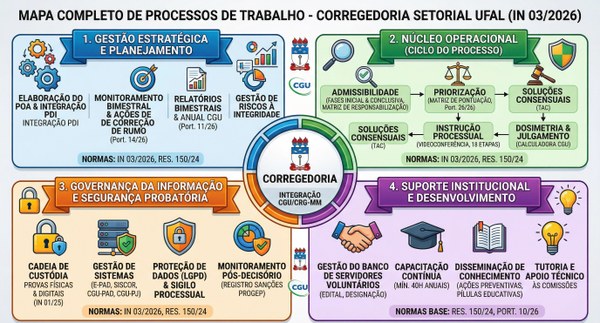 O mapeamento reflete a estrutura estratégica da Corregedoria Setorial da UFAL, detalhando o fluxo que integra o planejamento institucional ao ciclo operacional de correição. O modelo organiza as atividades em quatro eixos fundamentais: a gestão estratégica alinhada ao PDI, o núcleo operacional de apurações, a governança segura da informação probatória e o suporte contínuo ao desenvolvimento do corpo funcional por meio de tutoria técnica.